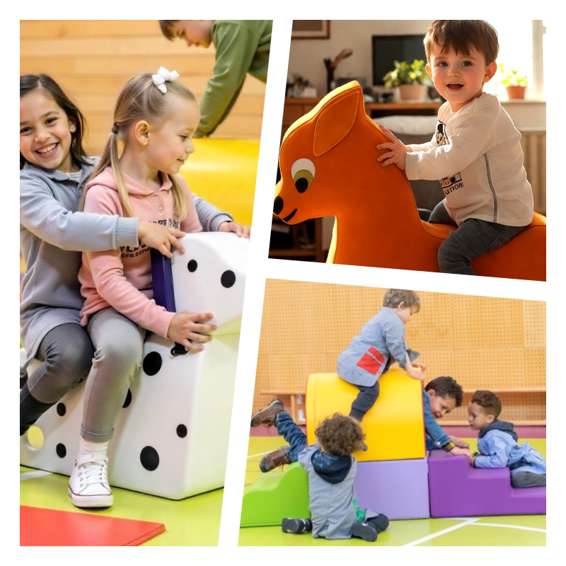 Paredes estofadas que protegem e acolhem; Pensado especialmente para bebés e crianças até aos 3 anos, o Soft Play é perfeito para creches, jardins de infância, zonas baby de parques indoor e espaços comerciais.